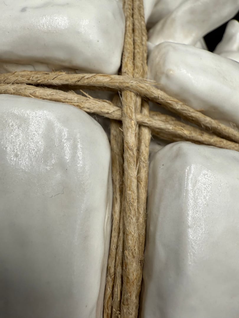 The rope, made of natural fibers wraps around the it. The tension in the rope is palpable, giving the impression that it’s squeezing the heart. This binding creates a complex interplay of textures – the smooth, unblemished surface of the heart against the rough, fibrous quality of the rope. The knots and twists in the rope add depth and visual interest to the piece, drawing the viewer’s eye across the sculpture.