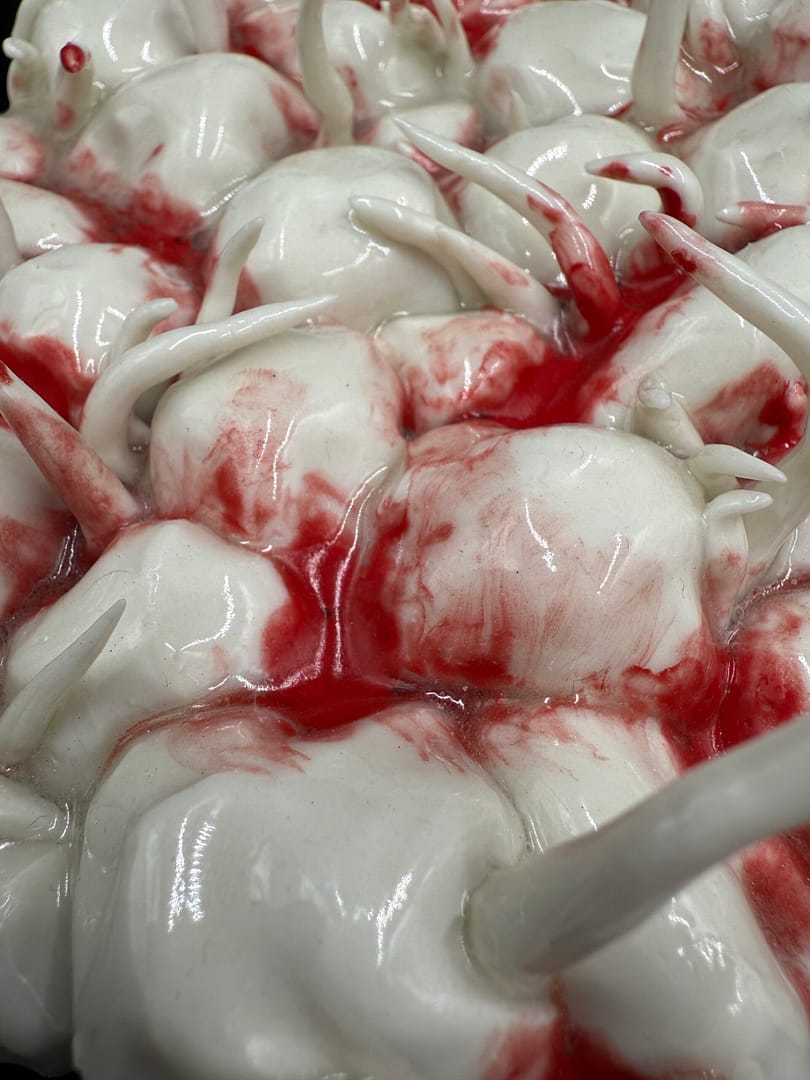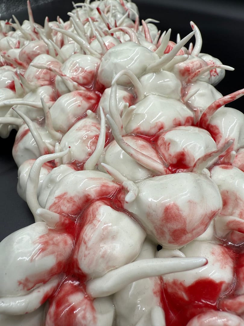 This porcelain bubble sculpture captivates with its unique interplay of texture, form, and color. Smooth, rounded bubbles cover the surface, creating an organic and tactile appearance. Among them, sharp protrusions emerge, introducing striking contrast and visual tension.