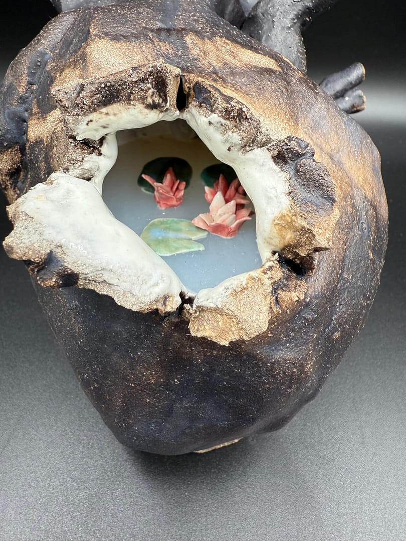 The heart sculpture depicts a black human heart with a dark, matte surface. On one side of the heart, there is an opening, inviting viewers to peer inside. As one looks through this opening, they discover an unexpected and surreal interior. The bottom half of the heart’s cavity is filled with silicone, creating the illusion of a still, glassy pool within the organ. Floating atop this silicone surface are delicate, miniature water lilies made of ceramic. These tiny pink blossoms are meticulously crafted, their petals open as if basking in an unseen sun. The lilies are arranged to resemble a serene, miniature lake nestled inside the heart. This juxtaposition of the dark, imposing exterior with the fragile, pastel-colored flora within creates a powerful visual metaphor. It suggests hidden depths, inner beauty and the contrast between outward appearance and inner life. The sculpture invites contemplation on themes of vulnerability, resilience, and the complex nature of human emotions