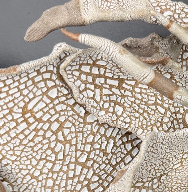 This stoneware sculpture explores the tension between balance and transformation. Formed in a mirrored construction, it invites the viewer to consider duality—how two halves can reflect, resist, or complete each other. It captures a dialogue between tension and stillness — where fragility meets strength. The crackled white glaze against the dark clay carries a sense of time passing, as if the piece is quietly aging alongside us.