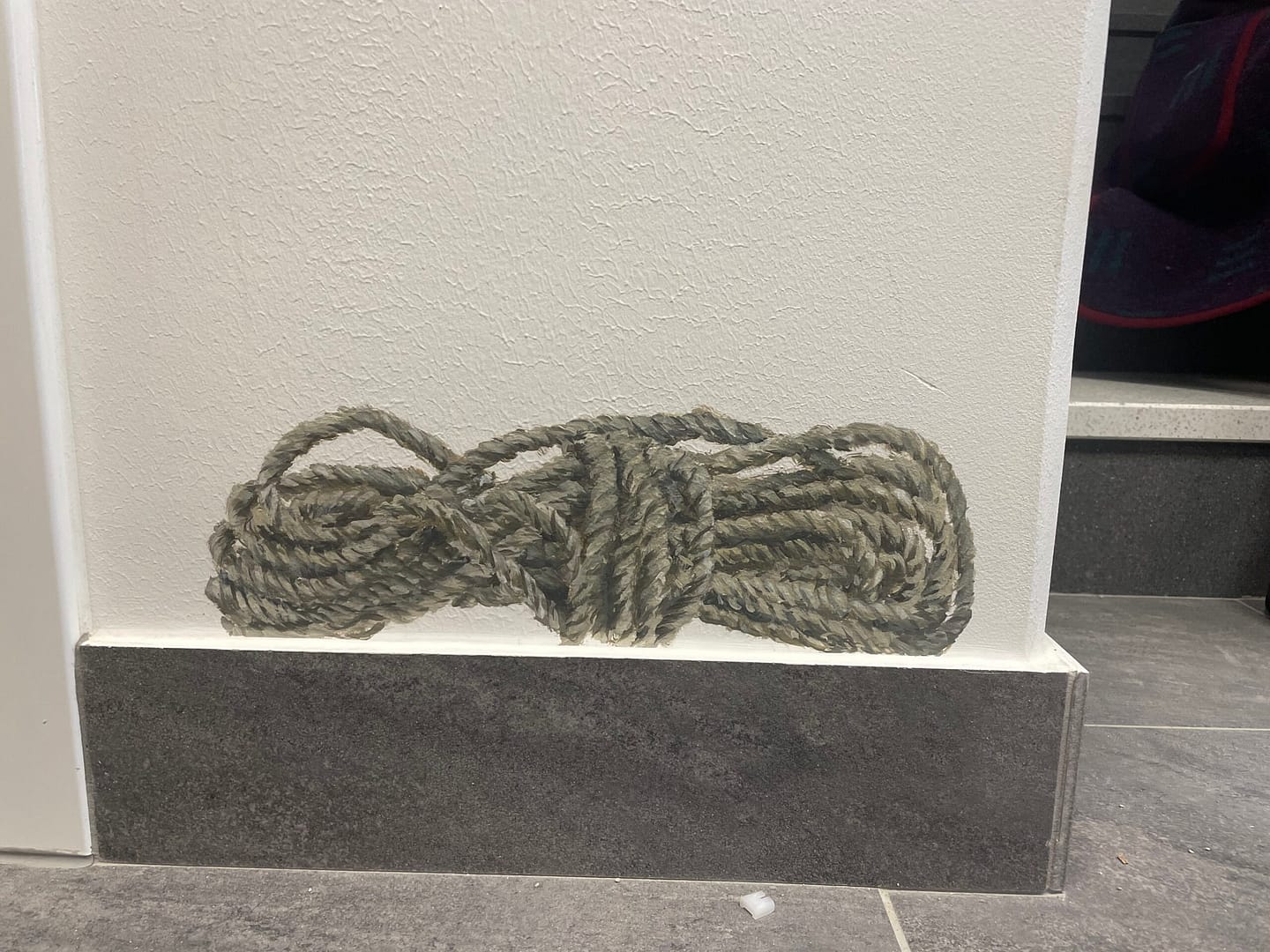 Moreover, coiled ropes, essential to any harbor, are depicted with remarkable realism. Their intricate twists and turns invite viewers to almost reach out and touch them. Unexpectedly, a fish dangles from a hook attached to a mailbox, adding a whimsical touch to the maritime tableau.