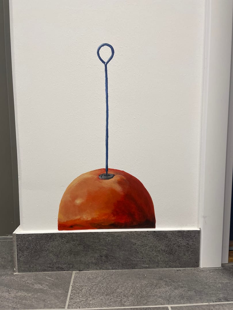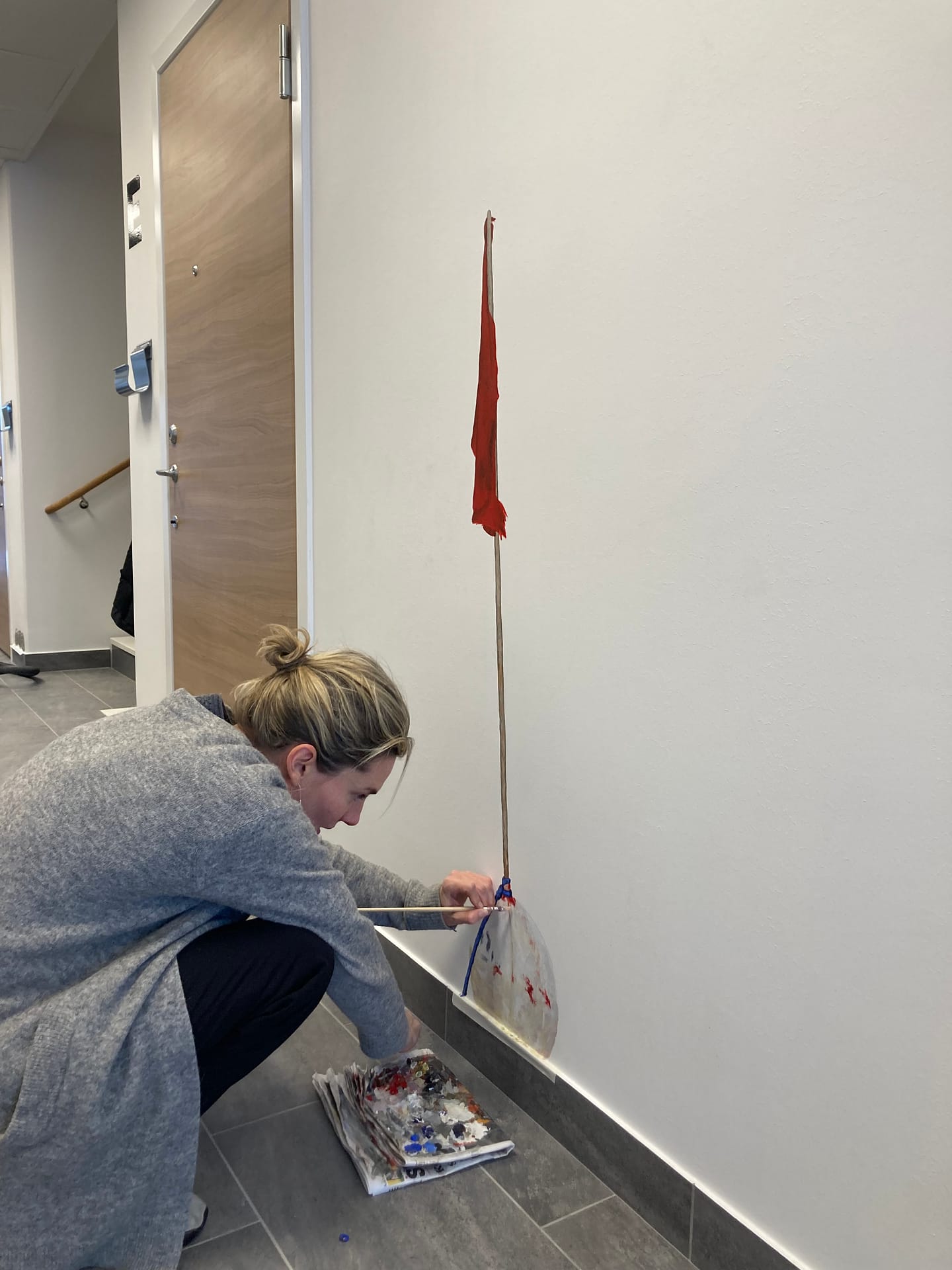 The stairwell walls come alive with meticulously painted details from Gotland’s harbor environments. Firstly, a bright white floating buoy with a fluttering flag catches the eye. It symbolizes maritime safety and navigation. Nearby, intricate fishnets drape across the wall. Their delicate patterns add texture and depth to the scene.