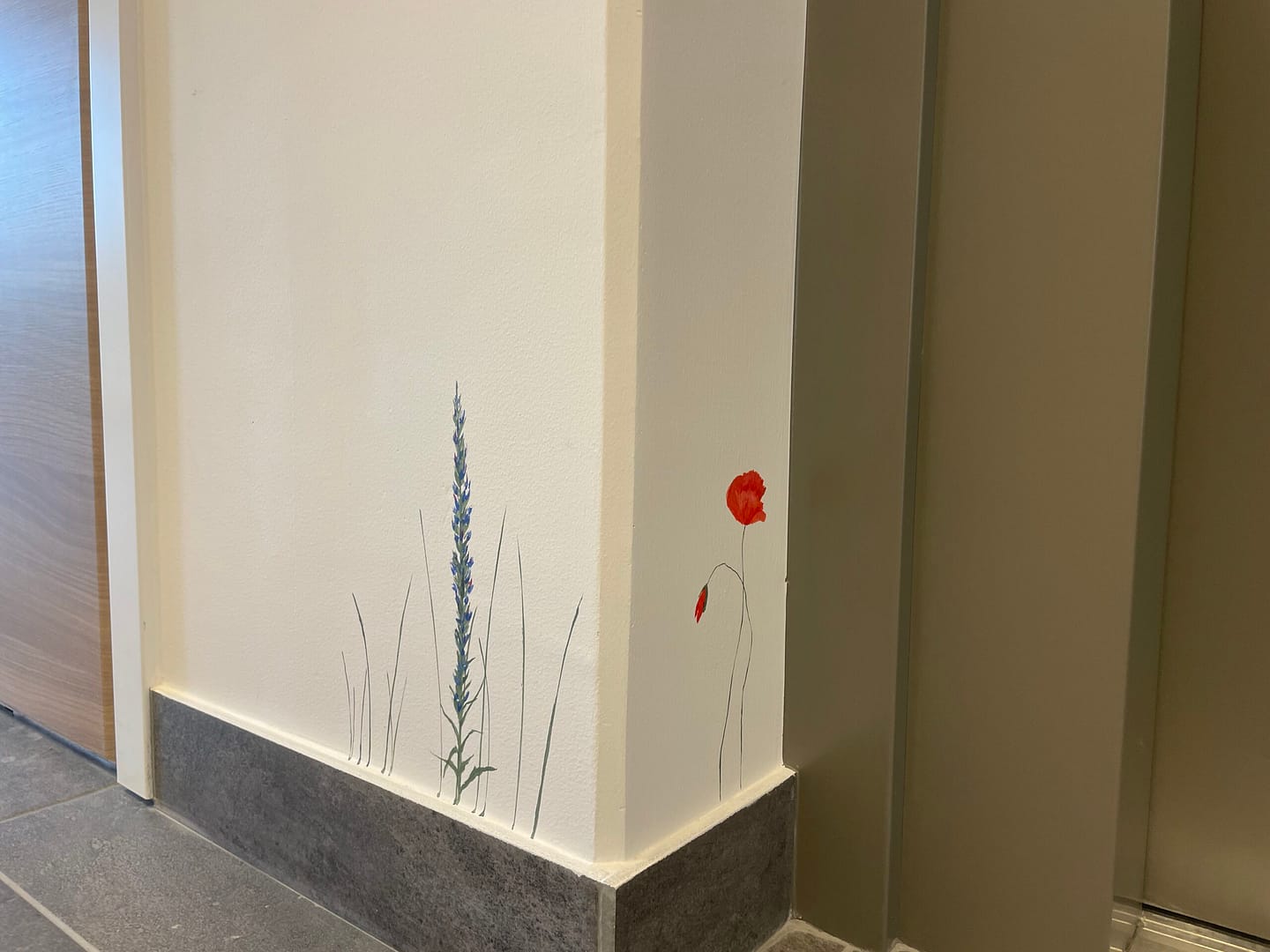 The stairwell walls showcase a meticulously recreated landscape of lush roadside vegetation. Tall grasses sway alongside delicate wildflowers, effectively mimicking Gotland’s abundant natural scenery. Moreover, the artist has carefully selected and depicted plant species commonly found in the area. Consequently, the mural ensures an authentic representation of Gotland’s botanical diversity.