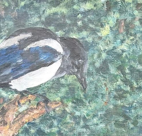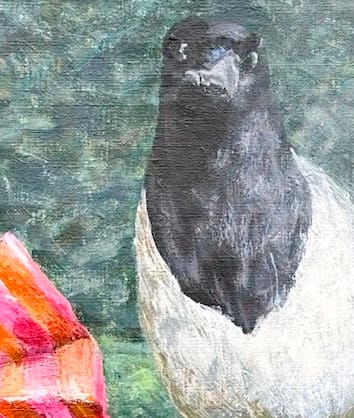 This work grows out of a desire to respond to that moment with tenderness rather than despair. The painting imagines an alternative gesture — one of joy, abundance, and celebration. The magpies are no longer bound by loss but gathered in recognition of life’s miracle, of continuation, of something precious being held and honored.